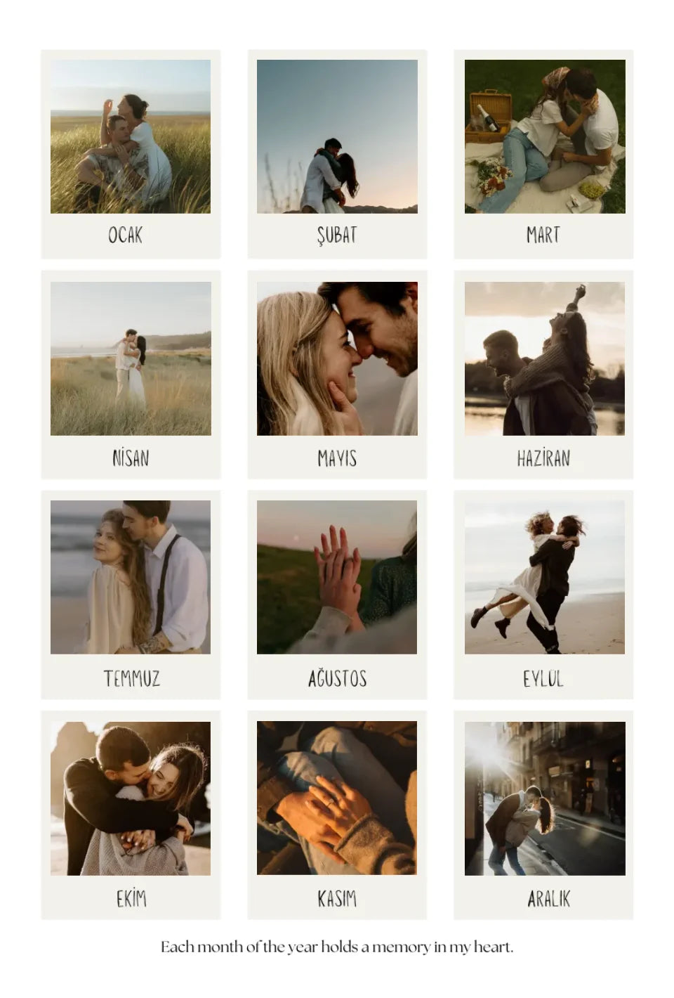 Yılın her ayını anılarınızla doldurun ve "12 Aylık Anılar" temalı bu kişiye özel posterle yaşam alanınıza anlam katın! Seçtiğiniz 12 fotoğraf ile tamamen özelleştirilebilir olan bu zarif tasarım, her ayı unutulmaz kılar. Sevdikleriniz için anlamlı bir hediye seçeneği sunar.