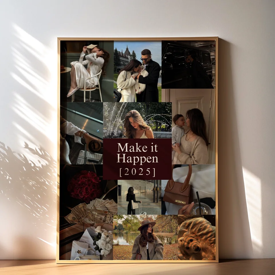 Hayallerinize ve hedeflerinize ulaşmak için ilham veren bu kolaj posteriyle, 2025 yılını unutulmaz hale getirin. "Make it Happen" temasıyla tasarlanan bu Vision Board, size her gün yeni bir motivasyon kaynağı sunar.