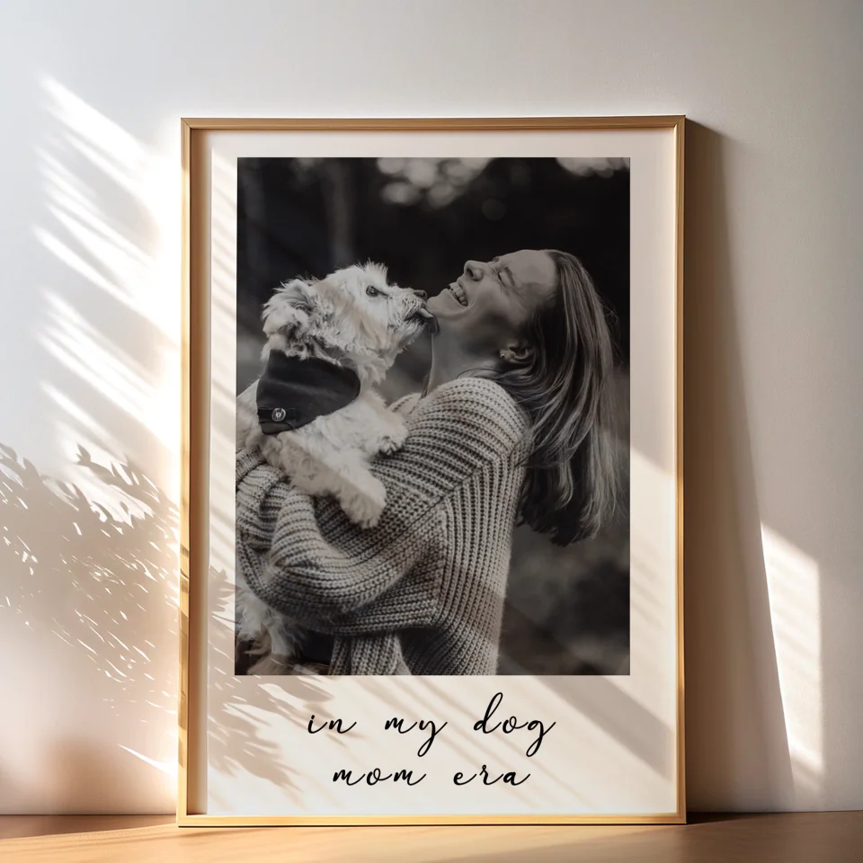 Köpeğinizle geçirdiğiniz özel anları bu kişisel posterle ölümsüzleştirin! "In my dog mom era" temalı poster, seçtiğiniz fotoğraf ile tamamen kişiselleştirilebilir. Evcil hayvan annelerine özel olarak tasarlanmış olan bu zarif poster, evinizin dekorasyonuna sıcak ve sevgi dolu bir dokunuş katarken, sevdiklerinize de anlamlı bir hediye alternatifi sunar.