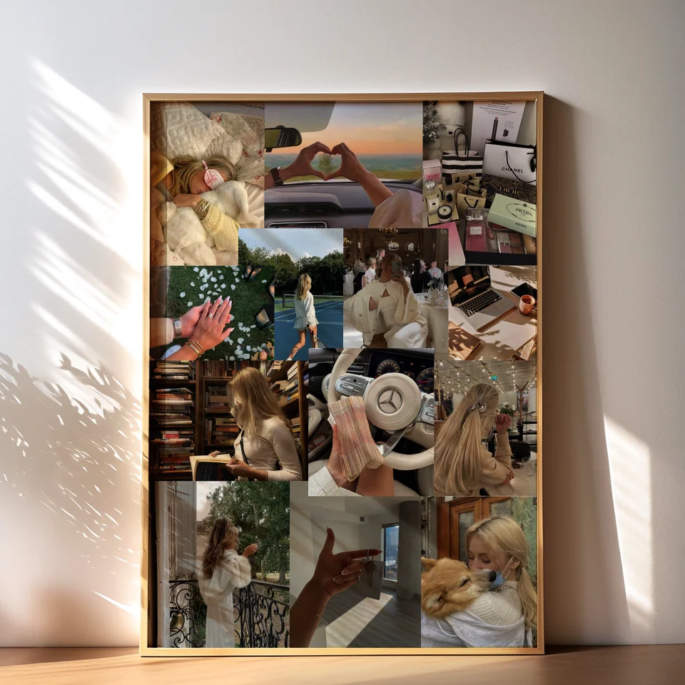 Bu eşsiz kolaj tasarımı, sevdiklerinize özel anılarınızı bir araya getirmenin en estetik yolu! Kolajdaki tüm fotoğraflar tamamen kişiselleştirilebilir ve sizin hikayenizi en güzel şekilde anlatmak için özenle düzenlenir.