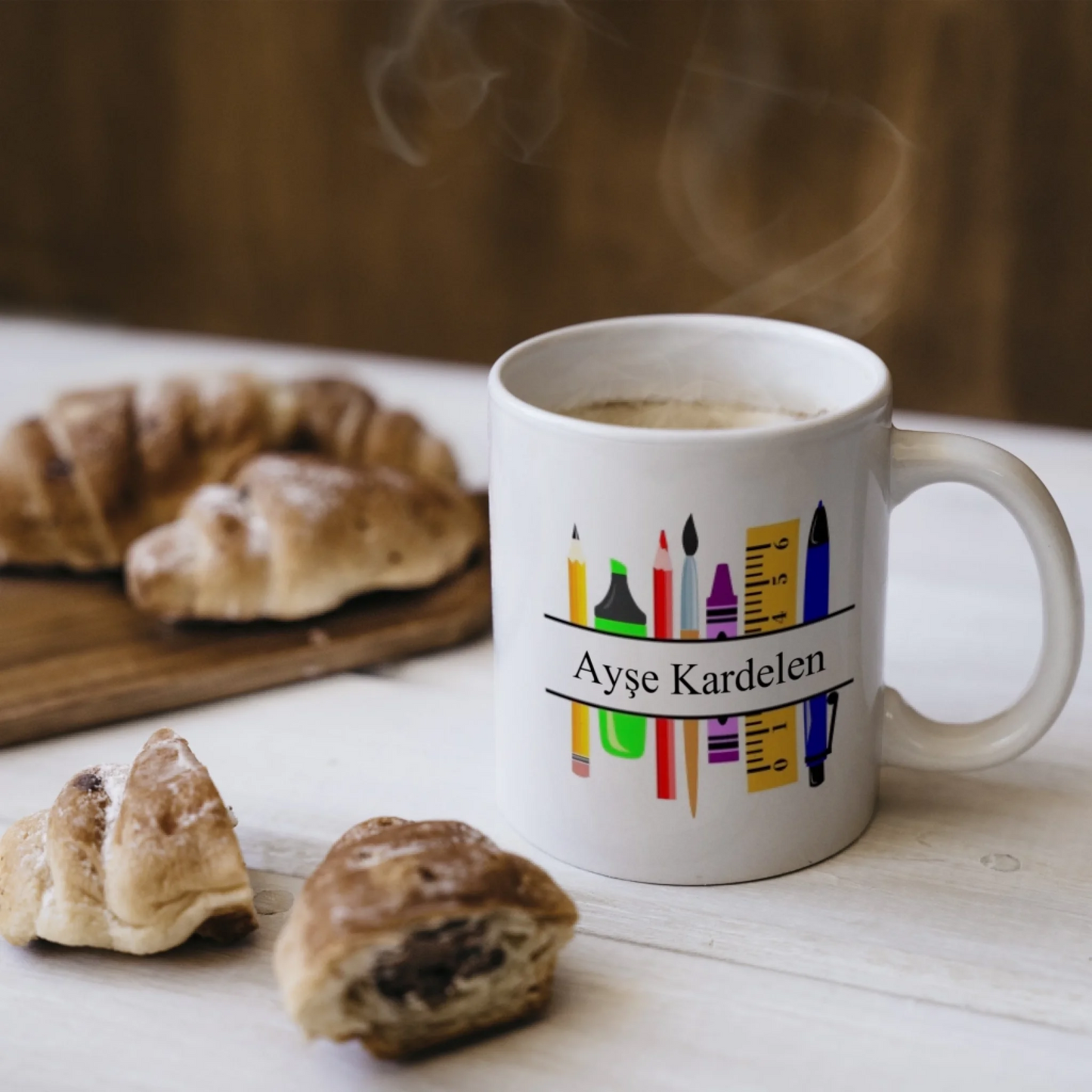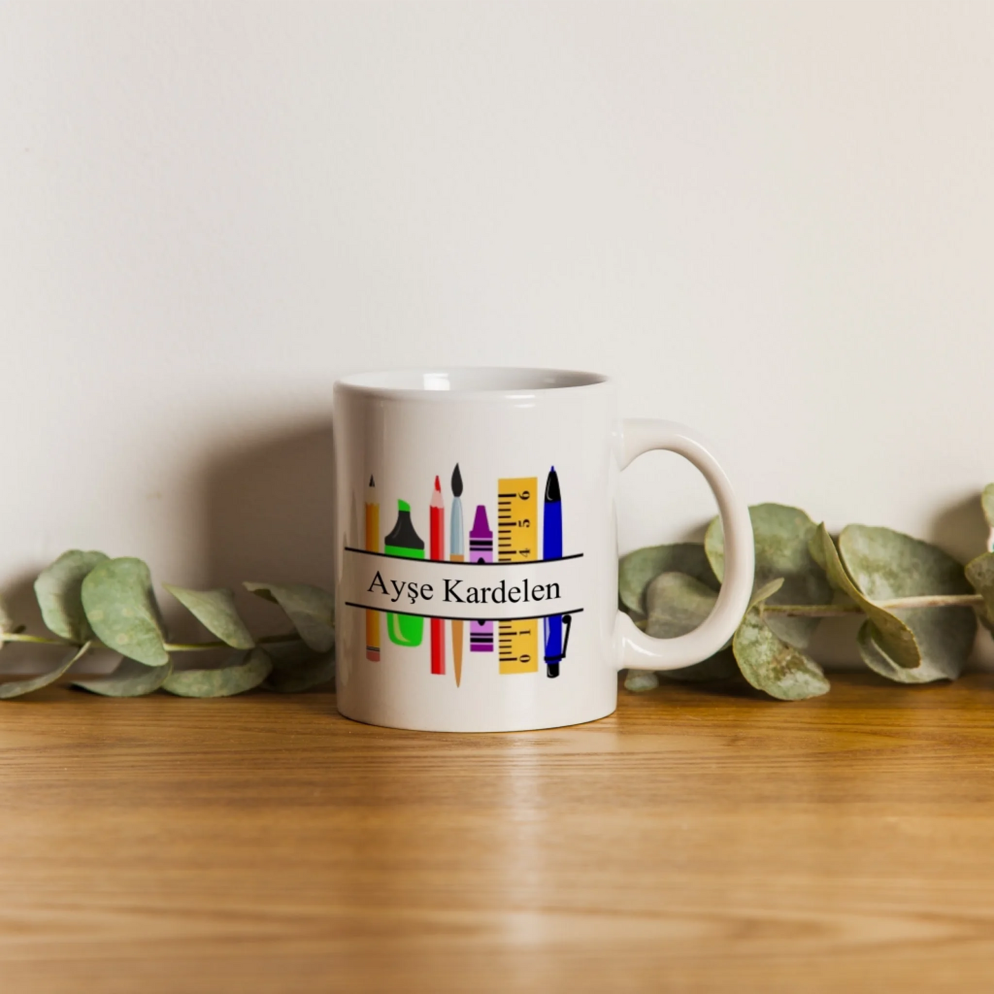 Kişiye Özel İsimli Kupa Bardak - Kalem Fırça Cetvel Desenli Resim Öğretmeni Hediye Fikri