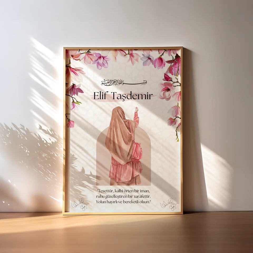 Tesettüre adım atan sevdiklerinizi bu özel ve anlamlı posterle tebrik edin! Üzerine isim eklenerek tamamen kişiselleştirilebilir bu poster, hem manevi bir hatıra hem de odanıza zarif bir dokunuş katacak dekoratif bir parça olacaktır.
